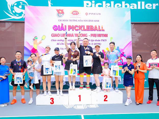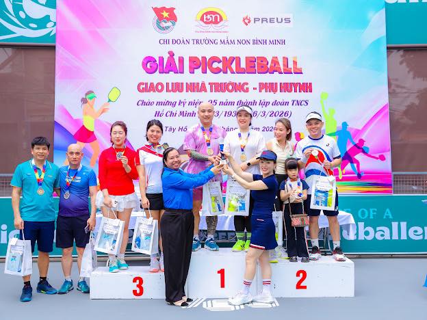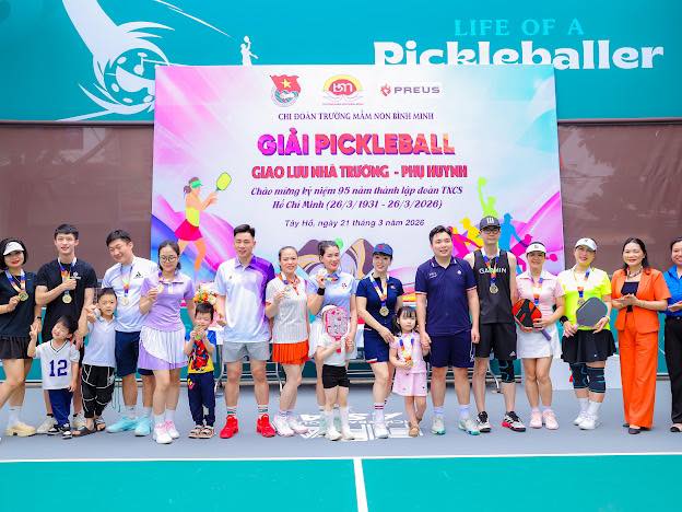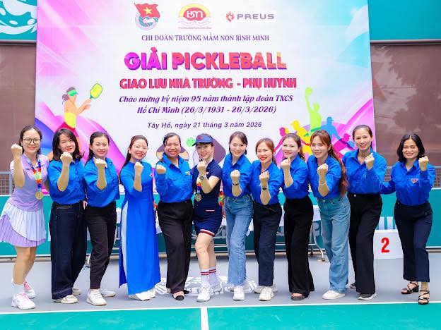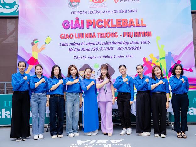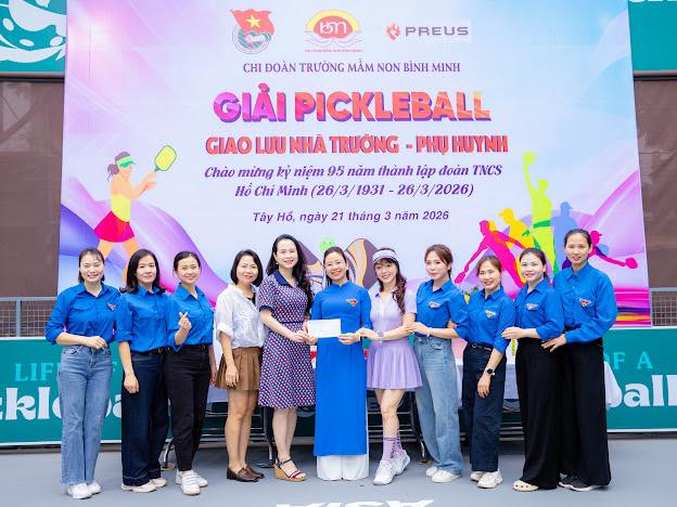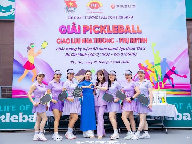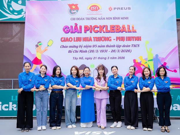 Hướng tới kỷ niệm 95 năm ngày thành lập Đoàn TNCS Hồ Chí Minh, sáng 21/3/2026, Chi đoàn Trường Mầm non Bình Minh phối hợp cùng nhà trường đã tổ chức giải Pickleball giao lưu đầy hào hứng giữa cán bộ, giáo viên, nhân viên và phụ huynh tại sân Green Tây Hồ. Đây là hoạt động ý nghĩa trong chuỗi Tháng Thanh niên của Chi đoàn.