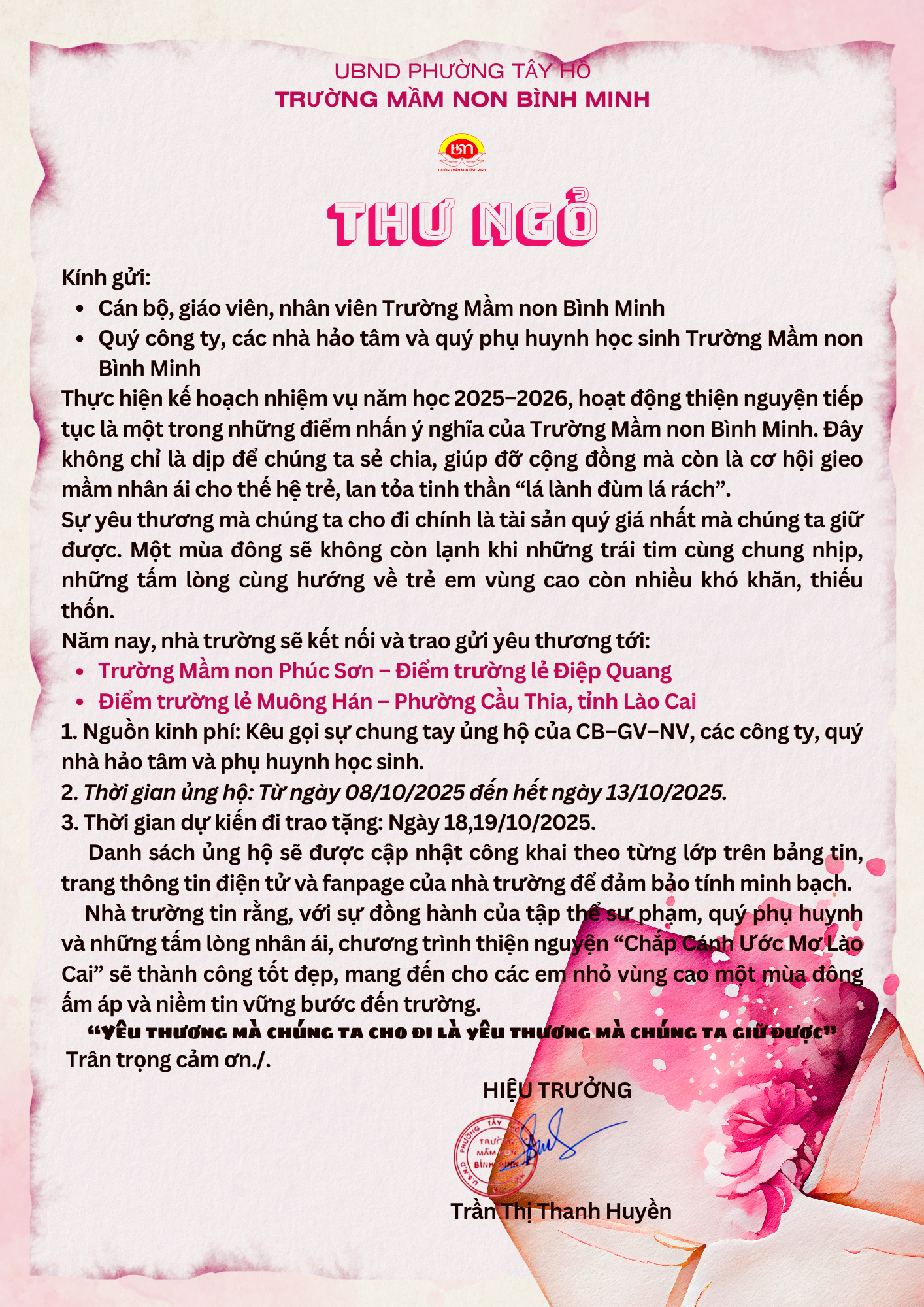 Nhà trường tin rằng, với sự đồng hành của tập thể sư phạm, quý phụ huynh và những tấm lòng nhân ái, chương trình thiện nguyện “Chắp Cánh Ước Mơ Lào Cai” sẽ thành công tốt đẹp, mang đến cho các em nhỏ vùng cao một mùa đông ấm áp và niềm tin vững bước đến trường.